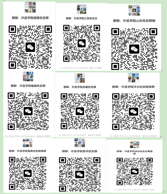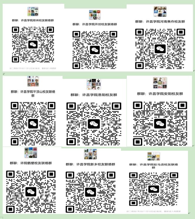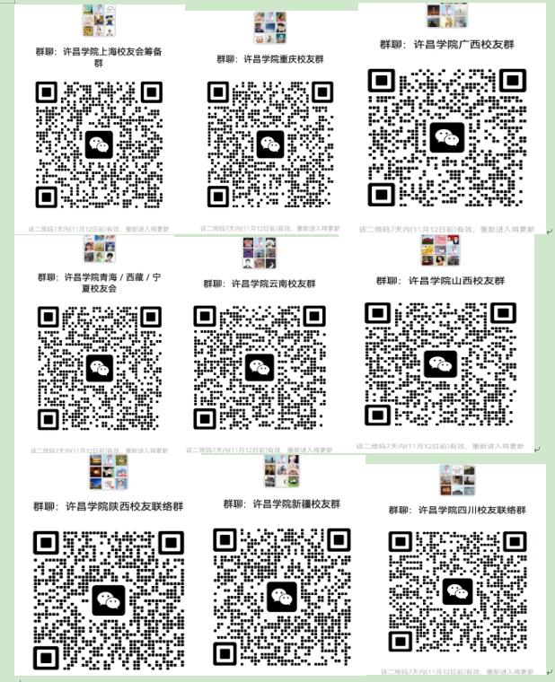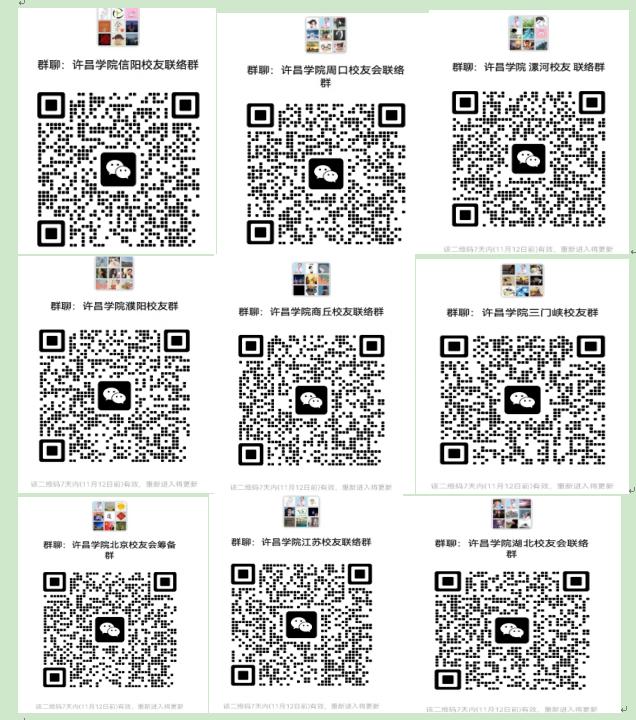 为了打造我校校友与母校、校友与校友之间联系与沟通的信息平台,更好的联络校友,沟通情感,互帮互助,增进友谊,加强校友之间交流互助,展现学校发展历程与校友的成就,凝聚人心,激励后人,号召广大许昌学院校友们注册许昌学院校友会小程序,同时加入自己所在地的校友微信群(部分地区可能未及时建立,请联系学校校友会建新群)。欢迎大家进入许昌学院校友会大家庭,若二维码有效期过期后大家还可电话0374-7355198咨询相关问题.