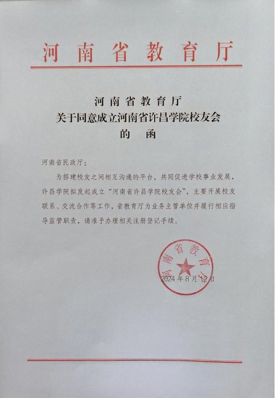 近日河南省教育厅对《许昌学院关于成立河南省许昌学院校友会的请示》进行了批复,并发函《河南省教育厅关于同意成立河南省许昌学院校友会的函》正式担任河南许昌学院校友会的业务主管单位,要求学校按照《社会团体登记管理条例》及相关法规政策的规定,及时向省民政部门申请登记备案。