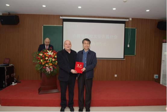 会上,郑直为许昌分会新当选会长胡国伟颁发聘书,两人共同为许昌学院校友会许昌分会揭牌。潘春彩为校友分会副会长、分会秘书长、副秘书长颁发聘书。新当选许昌分会会长胡国伟、校友代表李磊磊依次发言。